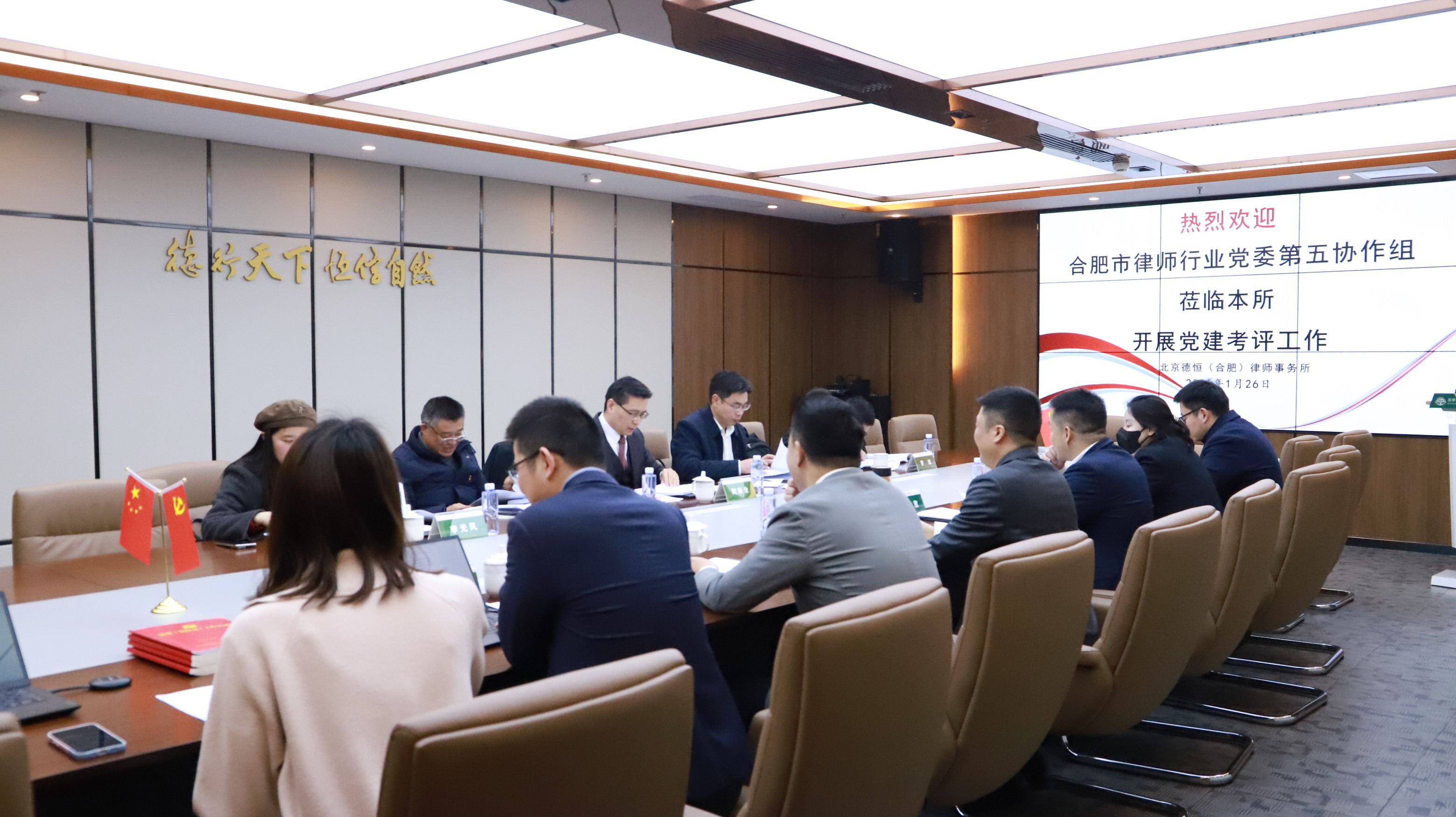 为贯彻落实市律师行业党委印发《关于开展2025年度律师事务所党建工作督查的通知》,1月26日上午,市律师行业党委第五协作组一行莅临北京德恒(合肥)律师事务所开展党建考评工作。本所党总支书记张本意、副书记吴丹、第一支部书记田多雨、第二支部书记李涧涛、第三支部书记陈发俊、党总支青年委员陈建华陪同参与考评工作。