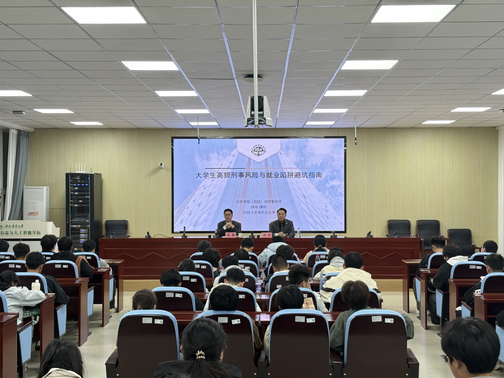 2026年3月26日,北京德恒(合肥)律师事务所股权及金融争议解决团队的林彬律师受邀赴安徽农业大学,为同学们开展《大学生高频刑事风险与就业陷阱避坑》专题讲座。机械与车辆工程学院党委副书记张璐在讲座开始前发表开场致辞,指出当前大学生面临的法律风险日益增多,法律意识的培养对于青年学子走向社会至关重要,充分肯定了本次讲座的现实意义。